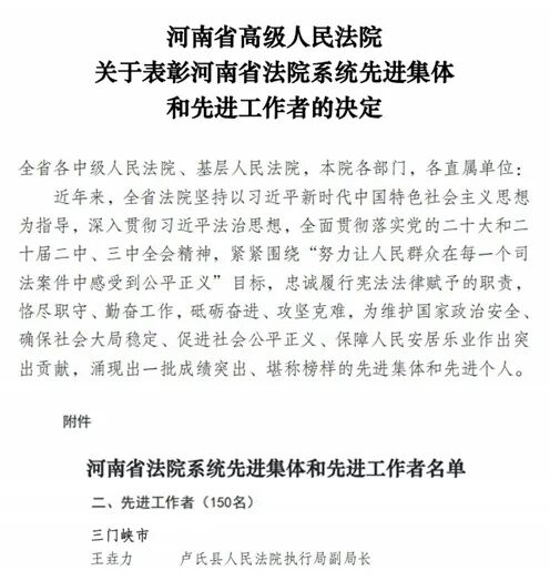 为表彰先进、激励队伍,进一步推动全省法院工作高质量发展,近日,河南省高级人民法院印发了《关于表彰河南省法院系统先进集体和先进工作者的决定》,授予卢氏县人民法院执行局副局长王垚力“河南省法院系统先进工作者”称号。