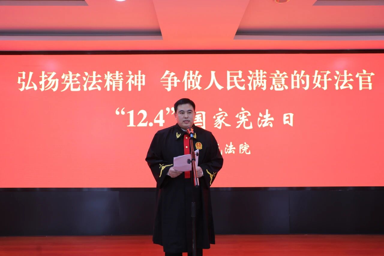 全体干警要紧紧围绕“弘扬宪法精神 争做人民满意的好法官”这一主题,担当作为,履职尽责。一要筑牢政治忠诚,做信念坚定的好法官;二要精进业务能力,做本领过硬的好法官;三要恪守为民宗旨,做群众满意的好法官;四要崇德修身,做清正廉洁的好法官。