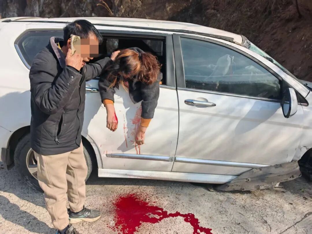 “快停车,救人!”四人立即将警车停靠在事故车后方约30米处,警灯闪烁警示过往车辆。现场弥漫着汽油味,车辆底盘仍在漏油。车内传来痛苦的呻吟声,三人迅速上前查看:驾驶员意识清醒但神情慌张;左后座女孩面部受伤、惊魂未定;右后座女士伤势最重,头部血流不止,面色苍白,呼吸急促。